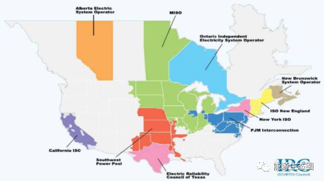 美國實(shí)際上是沒有全國性的電力市場的,從下圖可以看出,美國共有10個(gè)區(qū)域性的電力批發(fā)市場(包括德州、加州、紐約,包括稍后要介紹的PJM),其中有7個(gè)是設(shè)立了區(qū)域性的輸電組織,是有獨(dú)立系統(tǒng)運(yùn)營商、有組織的電力市場,其中最為有名的是PJM市場。