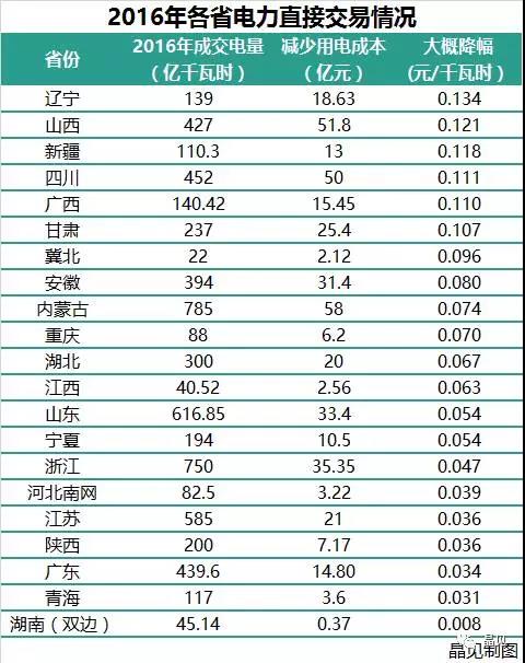 為了紀念直購電,更多的是為了探索市場化交易,晶見工作室整理了部份省份在2016年進行的電力直接交易的成交電量和用戶降低的用電成本,以及對應的降價幅度。