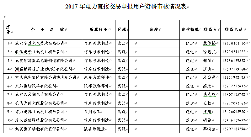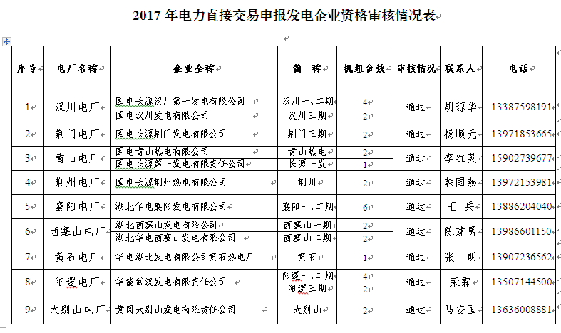 近日,省電力直接交易聯合工作小組召開專題審查會,按照省政府要求和《湖北省電力用戶與發(fā)電企業(yè)直接交易管理暫行辦法》、省發(fā)展改革委《關于組織開展2017年度電力直接交易工作的通知》規(guī)定的條件,對申報參加2017年電力直接交易的21家發(fā)電企業(yè)和288家用戶進行了資格審核,現將審核情況予以公示(附件一、附件二)。