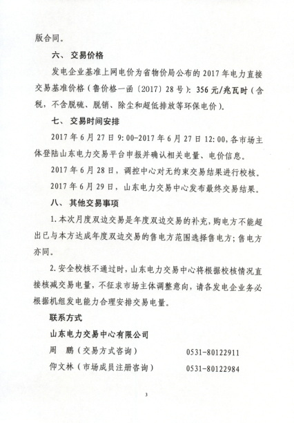 山東電力交易中心6月26日發(fā)布了山東省2017年7月電力直接交易(雙邊協(xié)商)公告,公告中稱,將于6月27日9:00-12:00開展山東省2017年7月電力直接交易(雙邊協(xié)商),交易價(jià)格為發(fā)電企業(yè)基準(zhǔn)上網(wǎng)電價(jià)為省物價(jià)局公布