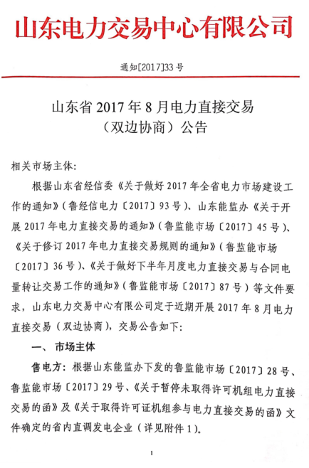 根據(jù)魯監(jiān)能市場〔2017〕87號通知要求,現(xiàn)組織開展2017年8月電力直接交易(雙邊協(xié)商),具體要求詳見交易公告。