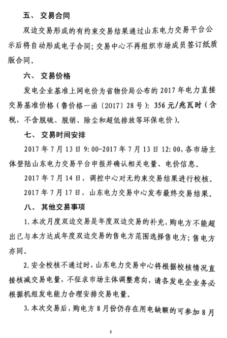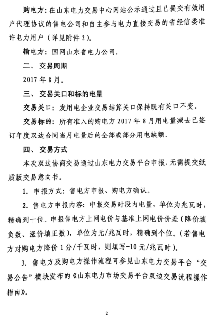 山東2017年8月電力直接交易(雙邊協(xié)商)展開
