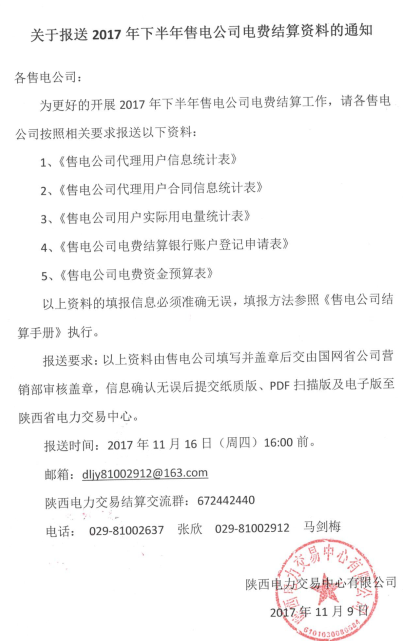 11月10日,陜西電力交易中心發(fā)布了《關(guān)于報(bào)送2017年下半年售電公司電費(fèi)》,按照相關(guān)要求報(bào)送以下資料: