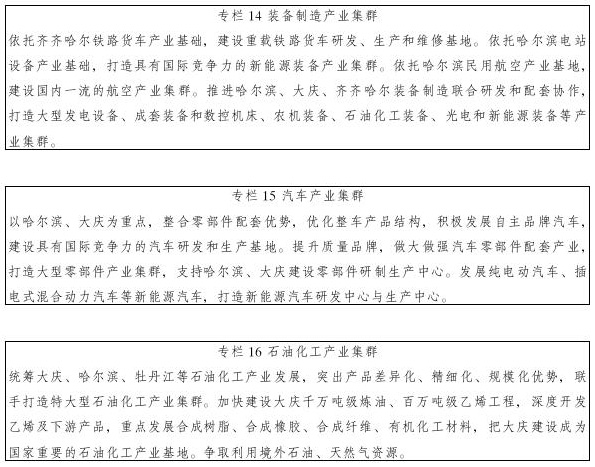 打造優(yōu)勢(shì)產(chǎn)業(yè)集群。以國(guó)內(nèi)有總需求增長(zhǎng)空間和黑龍江有競(jìng)爭(zhēng)優(yōu)勢(shì)的行業(yè)為重點(diǎn),優(yōu)化制造業(yè)空間布局,著力打造裝備制造產(chǎn)業(yè)集群、石油化工產(chǎn)業(yè)集群、汽車產(chǎn)業(yè)集群、農(nóng)林產(chǎn)品精深加工產(chǎn)業(yè)集群、戰(zhàn)略性新興產(chǎn)業(yè)集群等優(yōu)勢(shì)產(chǎn)業(yè)集群,促進(jìn)優(yōu)勢(shì)產(chǎn)業(yè)向中高端邁進(jìn)。