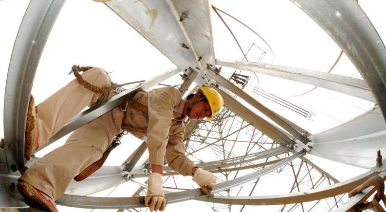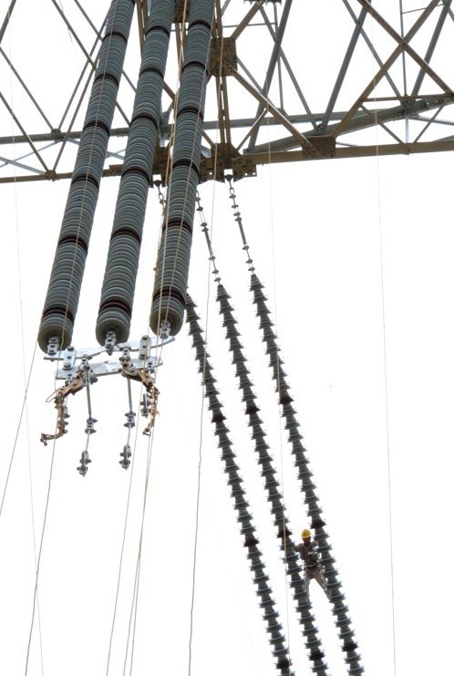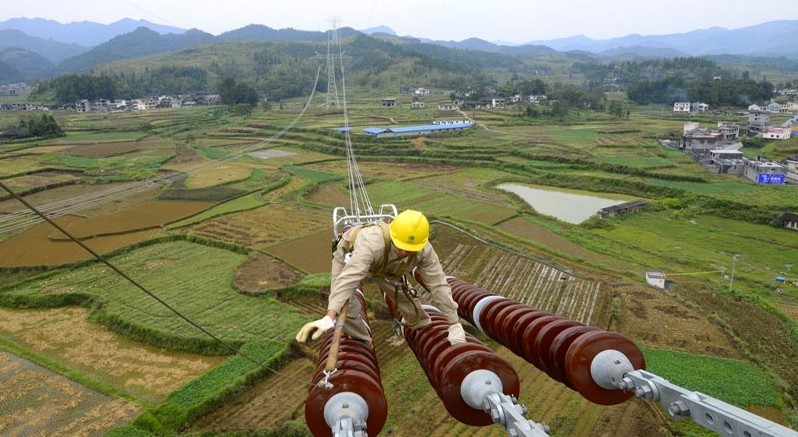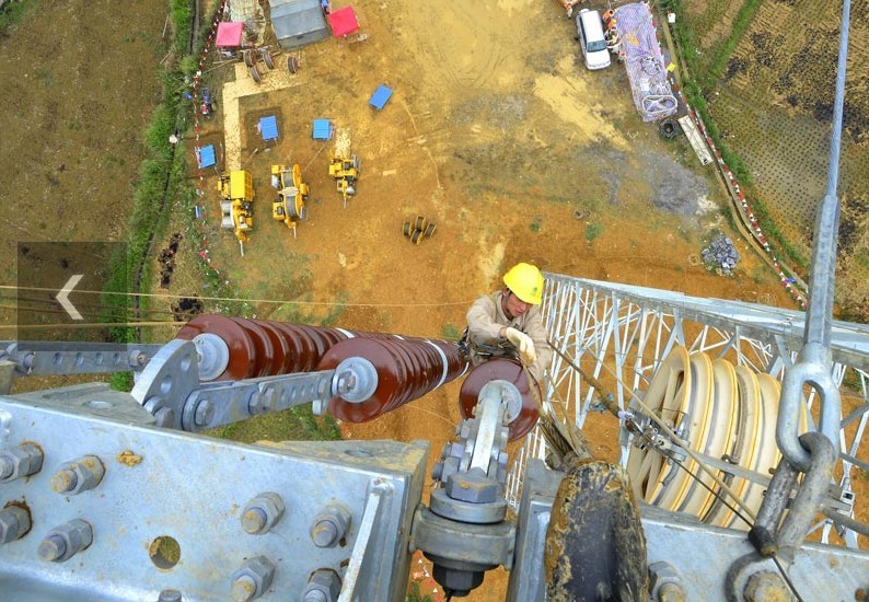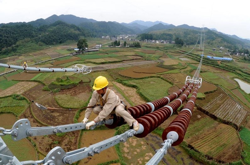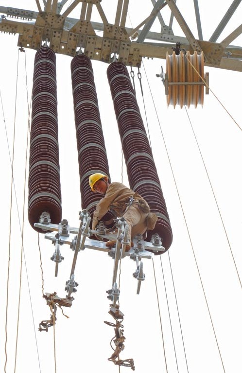 2013年9月26日,在貴州省銅仁市松桃縣,江蘇省送變電工程公司工作人員在±800千伏特高壓工程黔5標(biāo)段進(jìn)行架線施工。溪洛渡左岸至浙江金華±800千伏特高壓直流輸電工程是國家電網(wǎng)公司投資建設(shè)的又一條連接我國西南水電基地和東部負(fù)荷中心的能源大通道,起于四川宜賓雙龍換流站,終于浙江金華換流站,新建±800千伏直流輸電線路約1680公里,途經(jīng)四川、貴州、江西、湖南和浙江五省。工程額定輸送容量800萬千瓦,動態(tài)投資238.55億元。該工程建成后,每年可將西南地區(qū)約400億千瓦時清潔水電輸送至浙江,相當(dāng)于每年節(jié)省標(biāo)煤1228萬噸,減排二氧化碳超過3400萬噸。工程計(jì)劃于2014年6月實(shí)現(xiàn)雙極低端送電,2014年年底全部建成投運(yùn)。