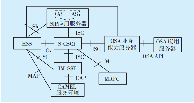 3)開(kāi)放業(yè)務(wù)架構(gòu)(Open Service Architecture,OSA)業(yè)務(wù)能力方式的業(yè)務(wù)提供。利用OSA提供的安全應(yīng)用程序編程接口(Application Programming Interface,API)接入IMS核心網(wǎng),OSA 業(yè)務(wù)能力服務(wù)器通過(guò)ISC接口與S-CSCF相連,實(shí)現(xiàn)OSA的API與SIP協(xié)議之間的轉(zhuǎn)換,通過(guò)SIP方式執(zhí)行一個(gè)或多個(gè)OSA業(yè)務(wù)。