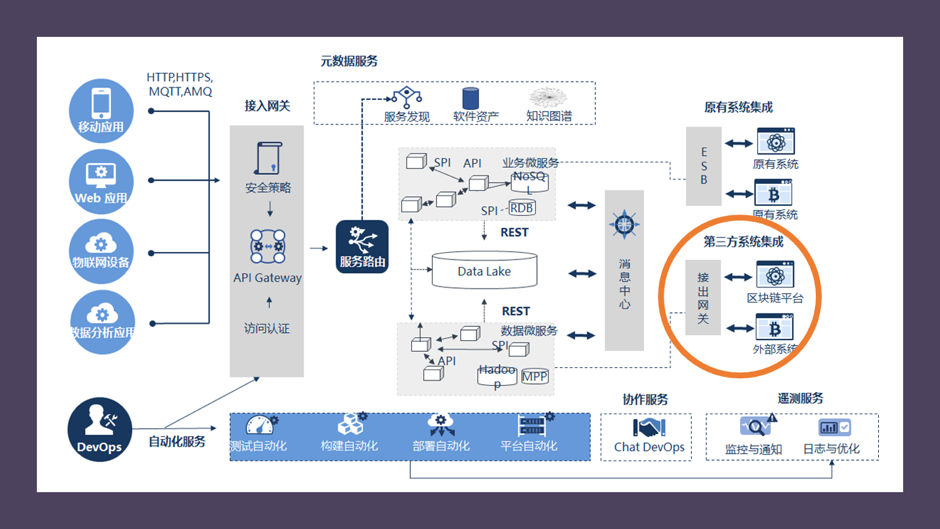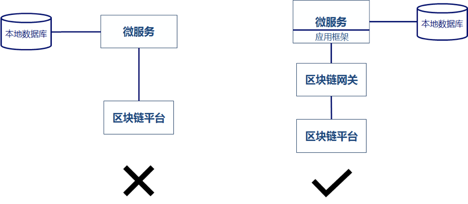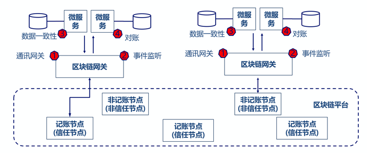 微服務(wù)通過區(qū)塊鏈網(wǎng)關(guān)與區(qū)塊鏈平臺交互,區(qū)塊鏈網(wǎng)關(guān)主要功能包括通訊網(wǎng)關(guān)、事件監(jiān)聽,同時配合微服務(wù)應(yīng)用框架,完成數(shù)據(jù)一致性、對賬功能。與區(qū)塊鏈網(wǎng)關(guān)集成的能力,是微服務(wù)架構(gòu)天生具備的。所以我們說微服務(wù)與區(qū)塊鏈,天生是一對。