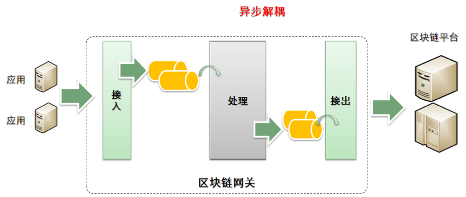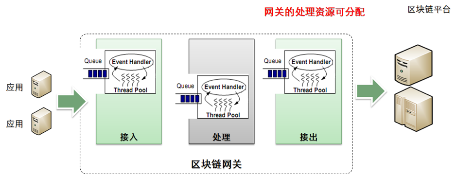 區(qū)塊鏈網(wǎng)關(guān)的內(nèi)部實現(xiàn)是一個 SEDA 架構(gòu)(分階段事件驅(qū)動架構(gòu)),把接入、接出和處理分開(處理主要是記錄流水、報文打解包、安全效驗等功能),三階段之間用隊列連接,采用異步模擬同步的方式,這是一個用于集成的基礎(chǔ)架構(gòu)。