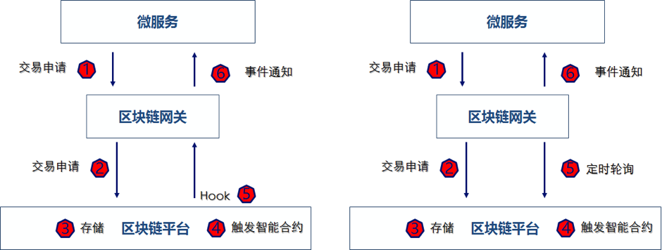 微服務(wù)可以注冊對某一類交易進行監(jiān)聽,區(qū)塊鏈網(wǎng)關(guān)定時通過區(qū)塊鏈平臺的查詢接口檢索,發(fā)現(xiàn)數(shù)據(jù)變更時通知微服務(wù)。這是一個效率不高的方法,但區(qū)塊鏈平臺本身性能也不高,時延主要由共識機制造成,輪詢的做法并不會有太大影響,這也是期待區(qū)塊鏈平臺本身提升的地方。