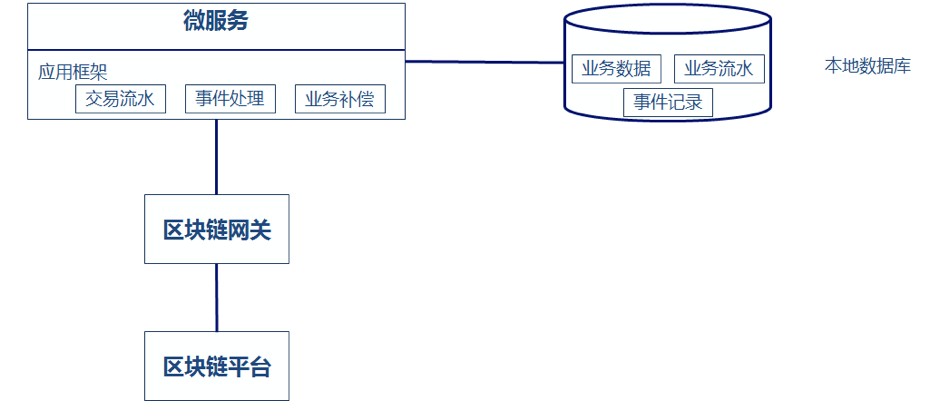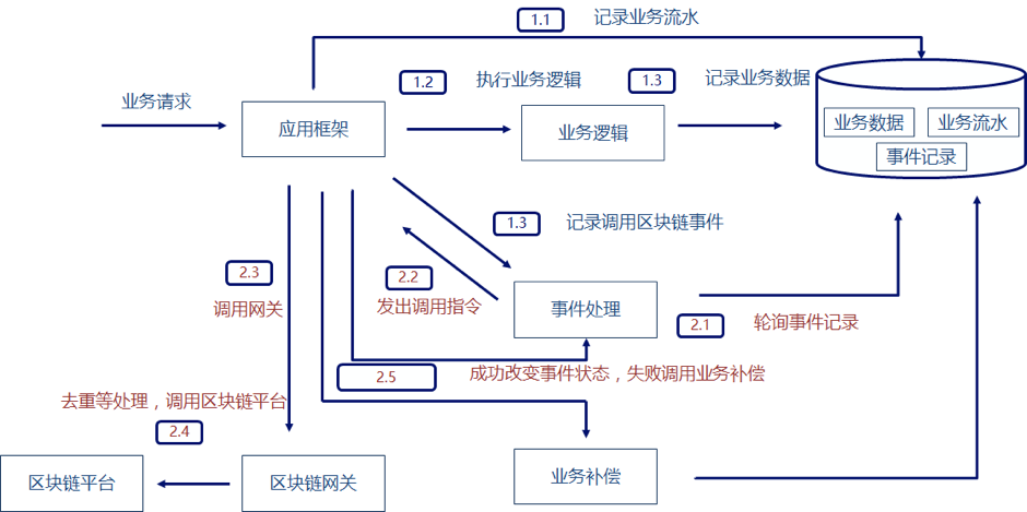 1)應(yīng)用框架接到請求后首先記錄業(yè)務(wù)流水,然后執(zhí)行業(yè)務(wù)邏輯,記錄業(yè)務(wù)數(shù)據(jù),最后在事件表中留下對區(qū)塊鏈平臺調(diào)用的記錄,事務(wù)完成