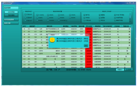 總結(jié)存明細(xì)管理根據(jù)電壓、報裝容量、上級電源進行組合查詢,通過查詢可得到總戶數(shù)和總結(jié)存容量信息,并提供對當(dāng)前信息的導(dǎo)出功能[10]。另外,根據(jù)預(yù)先設(shè)定的閾值,對累計時間超過300天和200天的業(yè)擴工程,提供預(yù)警提示功能(見