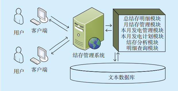 客戶端為用戶提供結(jié)存管理系統(tǒng)使用接口,實現(xiàn)結(jié)存管理和結(jié)存分析功能。系統(tǒng)完成對現(xiàn)有結(jié)存項目信息的精細(xì)化管理和分析,文本數(shù)據(jù)庫作為整個系統(tǒng)的持久化層,對所有結(jié)存項目信息及分析結(jié)果進行保存。