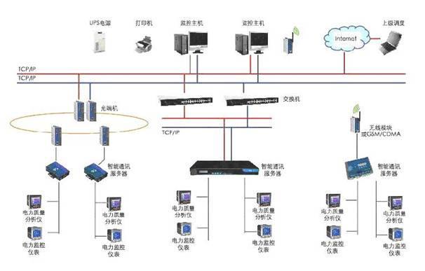 包括智能電力數(shù)據(jù)采集器(智能電表)、GPRS數(shù)據(jù)通訊網(wǎng)絡、數(shù)據(jù)采集服務器。所有智能數(shù)據(jù)采集單元相對獨立,按供電回路出線和負荷對應分布式配置,就地安裝在電氣柜內(nèi)或線路上,完成對工作點數(shù)據(jù)的采集和測量,通過GPRS無線網(wǎng)絡,上傳到數(shù)據(jù)采集服務器。