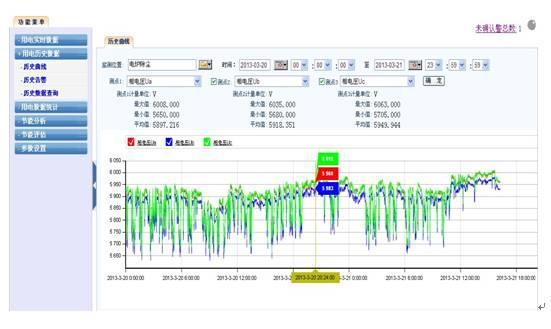 系統(tǒng)監(jiān)測并記錄電壓電流有功無功諧波及功率等用電數(shù)據(jù),具有強大的歷史數(shù)據(jù)追溯和分析功能,可以根據(jù)客戶的選擇的時間段生成曲線圖和用電數(shù)據(jù)報表,對不同的電力數(shù)據(jù)參量進行對比分析。
