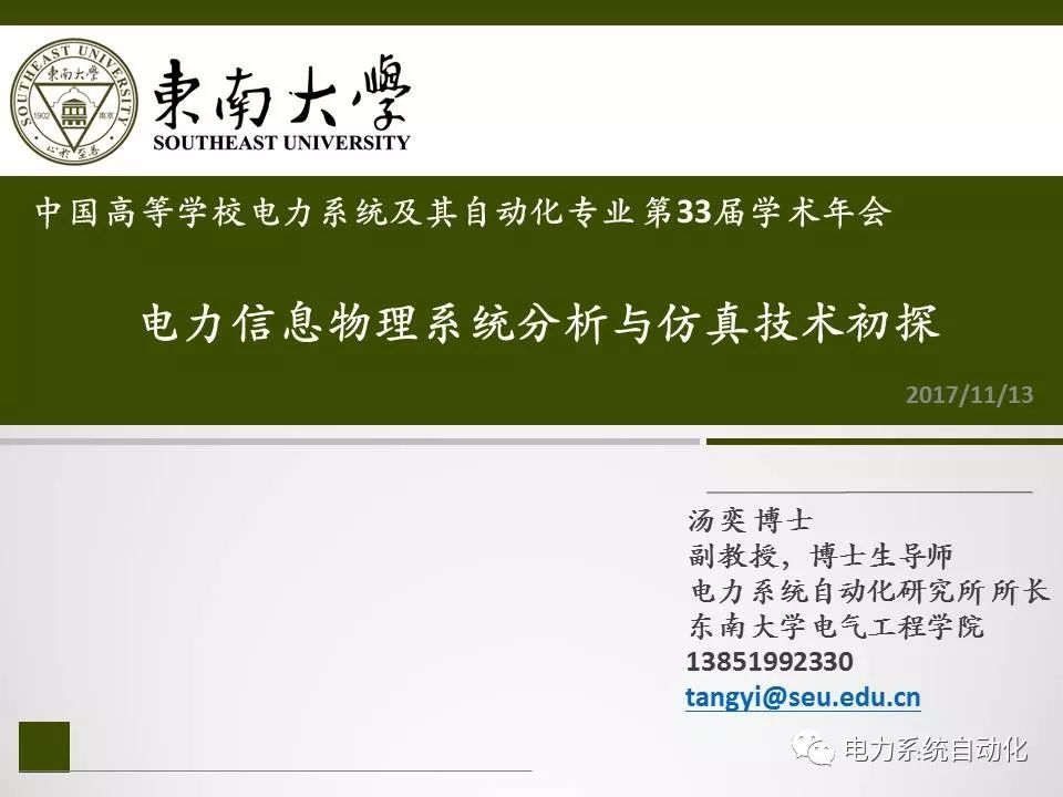 中國高等學校電力系統(tǒng)及其自動化專業(yè)第33屆學術年會日前在沈陽召開,東南大學湯奕副教授在“能源互聯(lián)網(wǎng)分論壇”上作了題為“電力信息物理系統(tǒng)分析與仿真技術初探”的專題報告。小編征得專家同意,在此分享報告PPT,歡迎品讀。