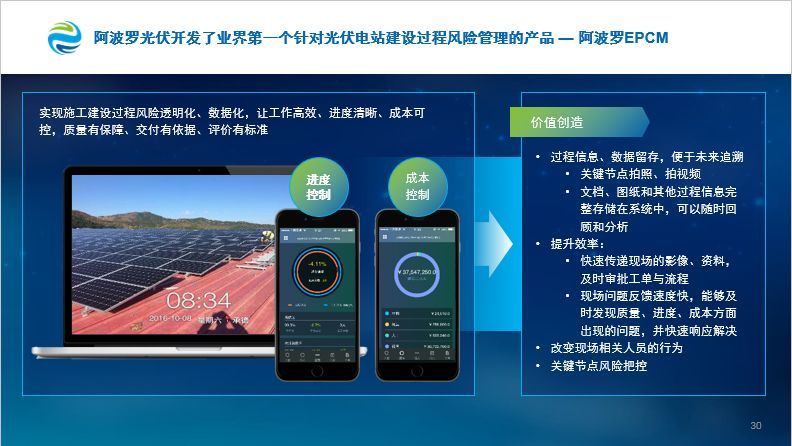 其次,業(yè)內(nèi)首個針對光伏電站建設(shè)期的過程風(fēng)險管理產(chǎn)品,阿波羅EPCM軟件接入施工安裝數(shù)據(jù),通過標(biāo)準(zhǔn)流程系統(tǒng)來保證電站驗收質(zhì)量。