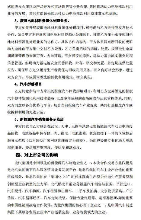 公司和北汽集團(tuán)在退役動力電池梯次利用和廢舊電池資源化處理體系、報廢汽車回收拆解體系及新能源汽車后服務(wù)等業(yè)務(wù)上開展強(qiáng)強(qiáng)合作,將有效解決新能源汽車與動力電池報廢后的回收利用難題,促進(jìn)新能源汽車走向從綠色消費(fèi)到綠色回收的“綠色到綠色”閉路循環(huán),是落實國家綠色發(fā)展的具體實踐,是落實國家對汽車和動力電池回收利用要求的良好體現(xiàn),本次合作將打通公司與世界大型新能源汽車產(chǎn)業(yè)集團(tuán)合作回收動力電池的通道,可以有效促進(jìn)公司“動力電池回收—原料再造—材料再造---動力電池包再造---新能源汽車服務(wù)”新能源全生命周期價值鏈的有效實施,促進(jìn)公司實現(xiàn)經(jīng)濟(jì)效益、環(huán)境效益與社會效益的有機(jī)統(tǒng)一,樹立報廢新能源汽車、動力電池回收利用與循環(huán)經(jīng)濟(jì)模式典范,對公司建設(shè)全球領(lǐng)先的動力電池回收利用模式與回收產(chǎn)能意義重大。