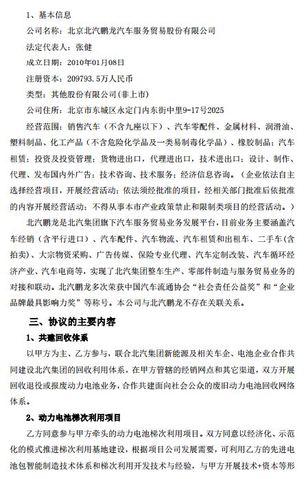 1、共建回收體系以甲方為主、乙方參與,聯(lián)合北汽集團(tuán)新能源及相關(guān)車企、電池企業(yè)合作共同建設(shè)北汽集團(tuán)的回收利用體系,在甲方管轄的經(jīng)銷網(wǎng)點(diǎn)和其它渠道,雙方開展回收退役或報廢動力電池業(yè)務(wù),合作共建面向社會公眾的廢舊動力電池回收網(wǎng)絡(luò)體系。