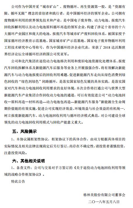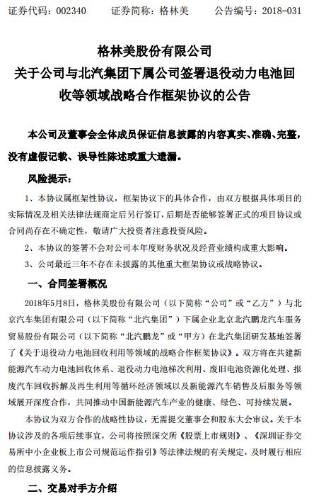 2018年5月8日,格林美股份有限公司(以下簡稱“公司”或“乙方”)與北京汽車集團(tuán)有限公司(以下簡稱“北汽集團(tuán)”)下屬企業(yè)北京北汽鵬龍汽車服務(wù)貿(mào)易股份有限公司(以下簡稱“北汽鵬龍”或甲方)在北汽集團(tuán)研發(fā)基地簽署了《關(guān)于退役動力電池回收利用等領(lǐng)域的戰(zhàn)略合作框架協(xié)議》。雙方將在共建新能源汽車動力電池回收體系、退役動力電池梯次利用、廢舊電池資源化處理、報廢汽車回收拆解及再生利用等循環(huán)經(jīng)濟(jì)領(lǐng)域以及新能源汽車銷售及后服務(wù)等領(lǐng)域展開深度合作,共同推動中國新能源汽車產(chǎn)業(yè)的健康、綠色、可持續(xù)發(fā)展。