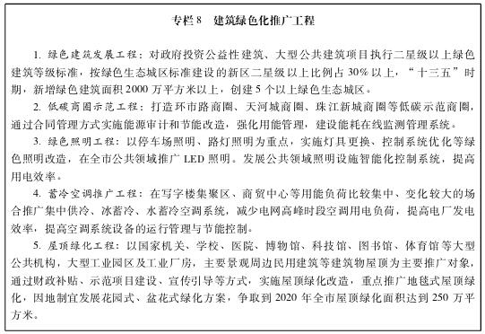 在城市發(fā)展新區(qū)規(guī)劃、建設(shè)和運(yùn)營中落實(shí)綠色低碳理念,建立包括綠色建筑比例、公共交通、可再生能源利用、中水利用、廢棄物回收利用等內(nèi)容的綠色生態(tài)城區(qū)指標(biāo)體系,推動綠色市政、綠色交通、綠色能源等領(lǐng)域創(chuàng)新發(fā)展,2020年創(chuàng)建5個以上綠色生態(tài)城區(qū)。